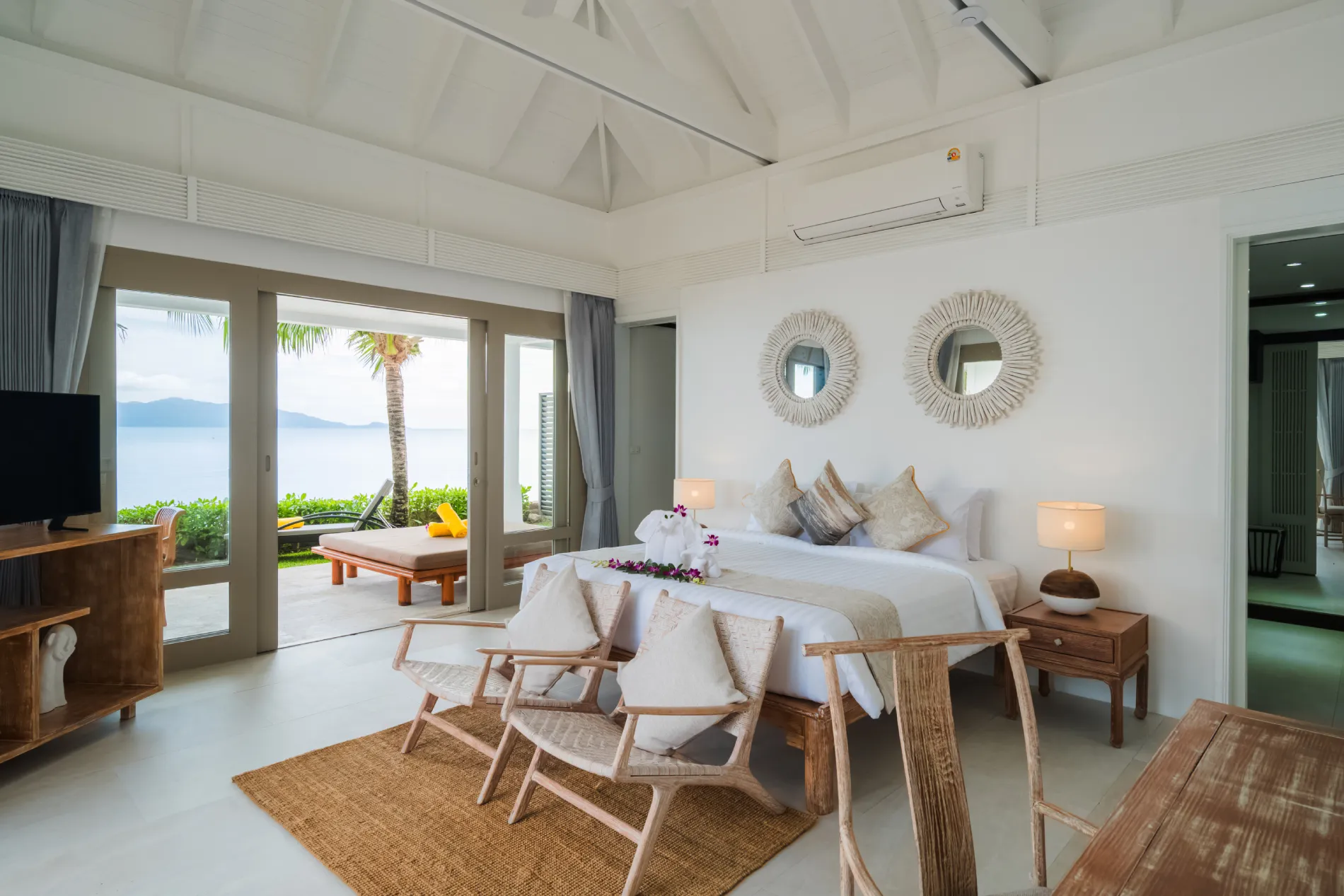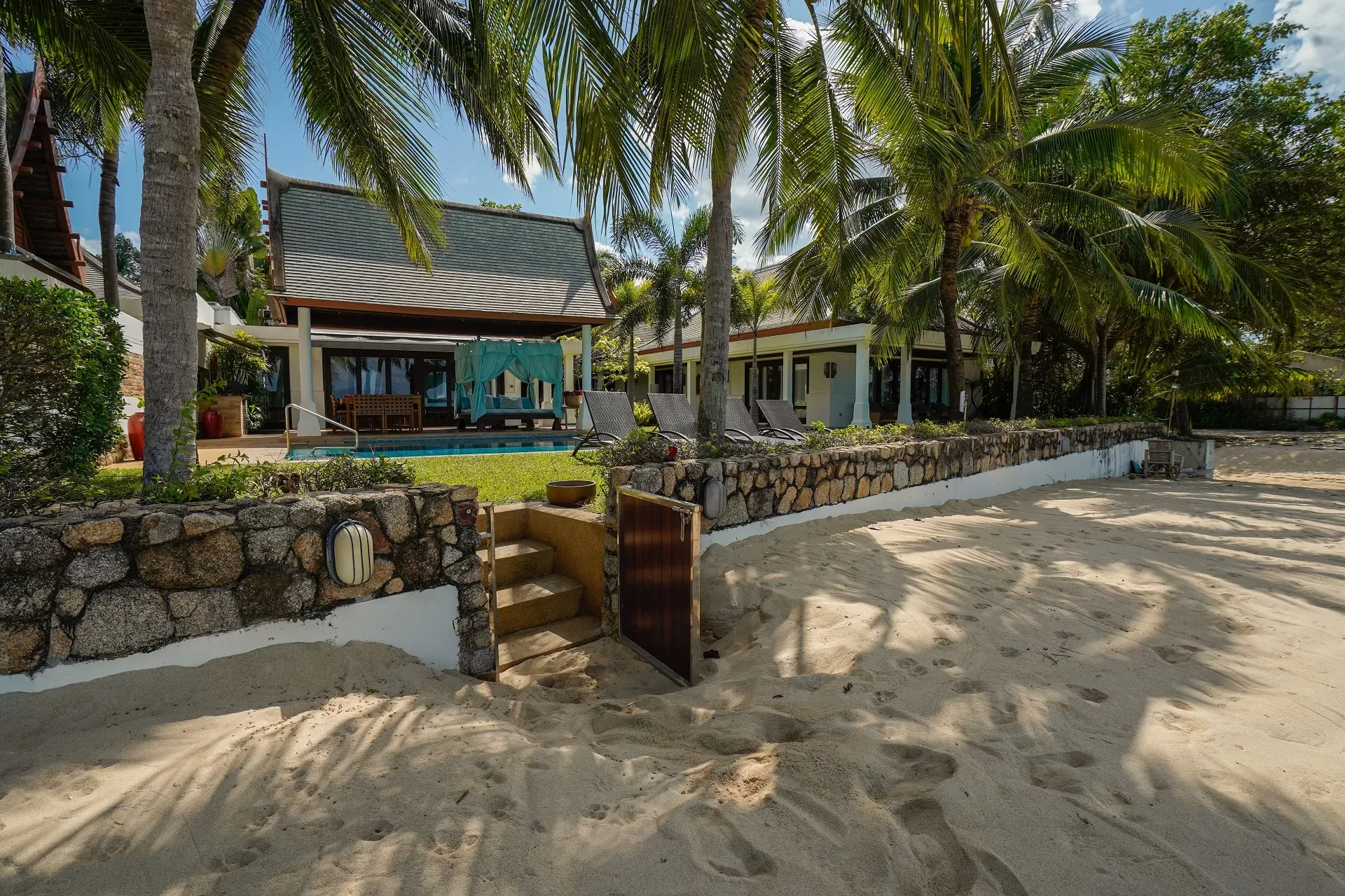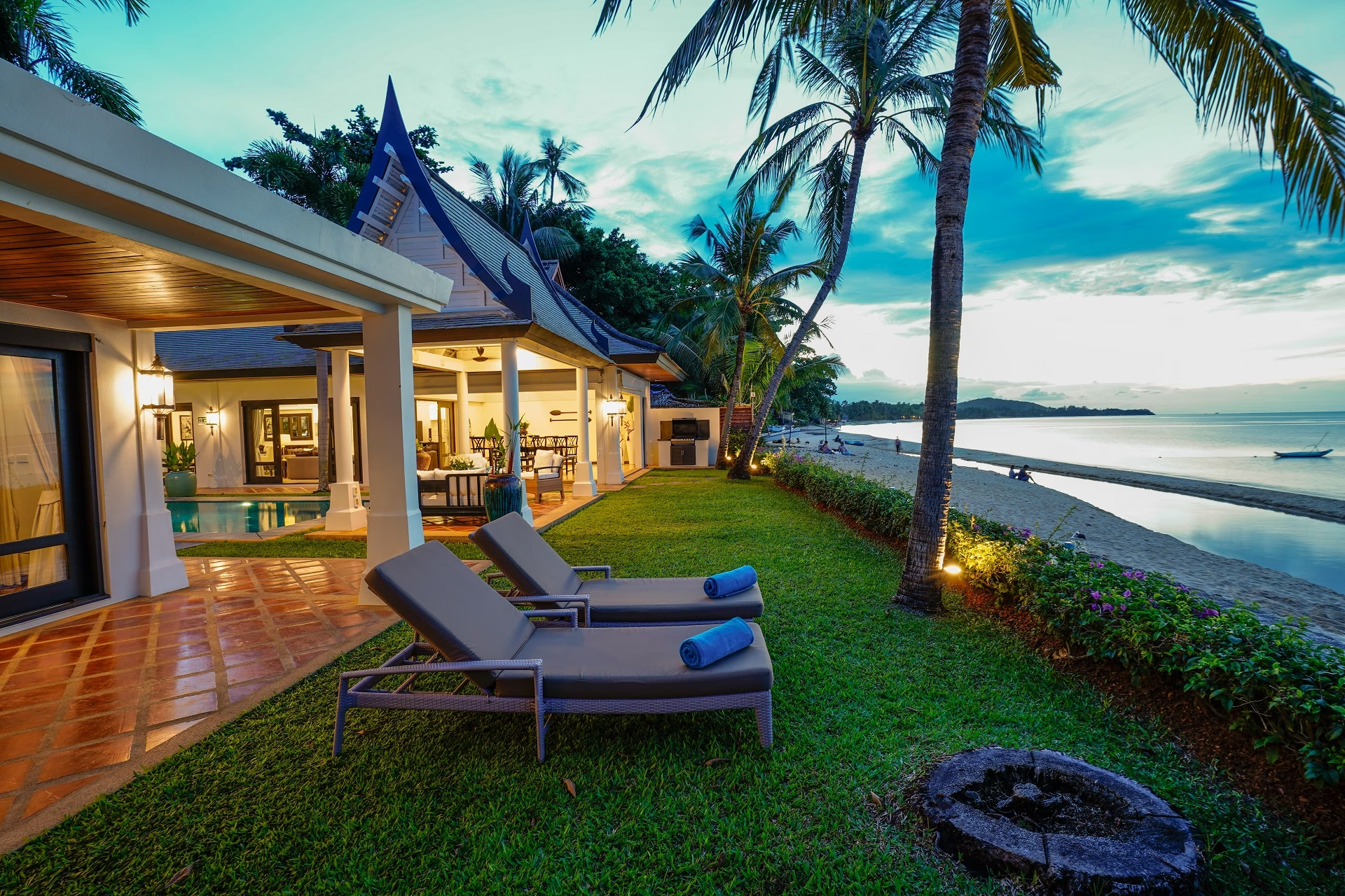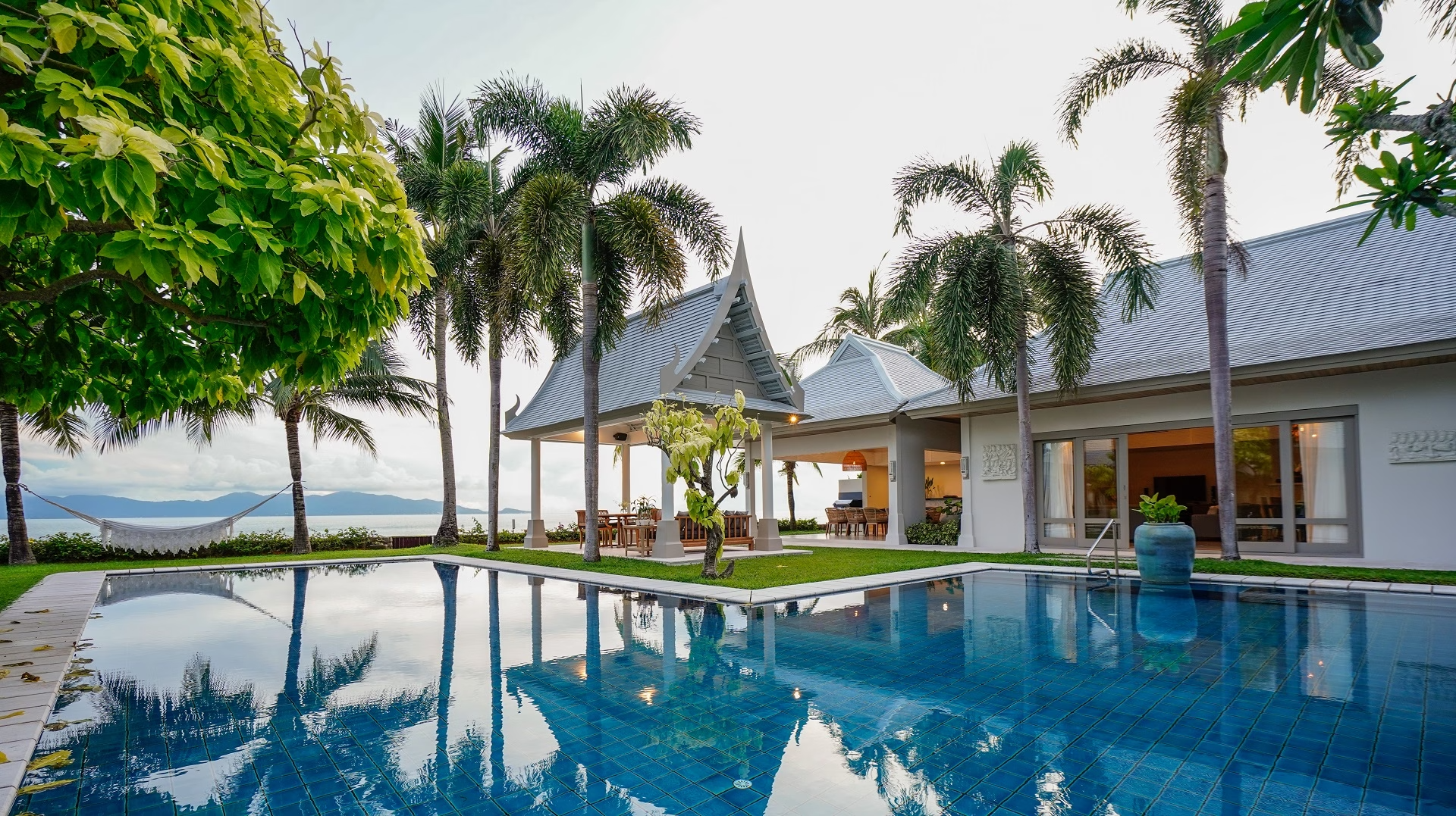 This stunning five-bedroom villa will transport you to Bali with its contemporary whitewashed interior, wood carvings and rattan furnishings. To make the most of the impressive 36 meters of beach frontage, each room is situated around the pool, while the spacious grounds feature tropical gardens, a shaded Thai sala and a large living area.$ 1,995 per night
