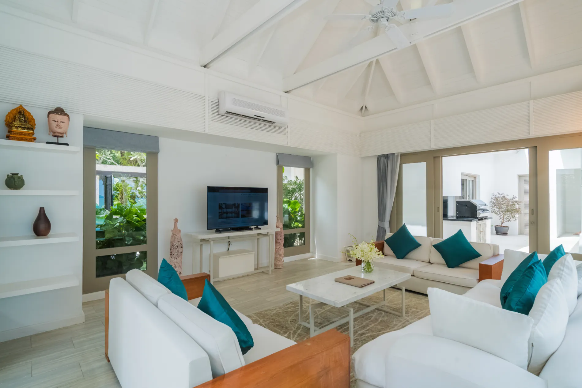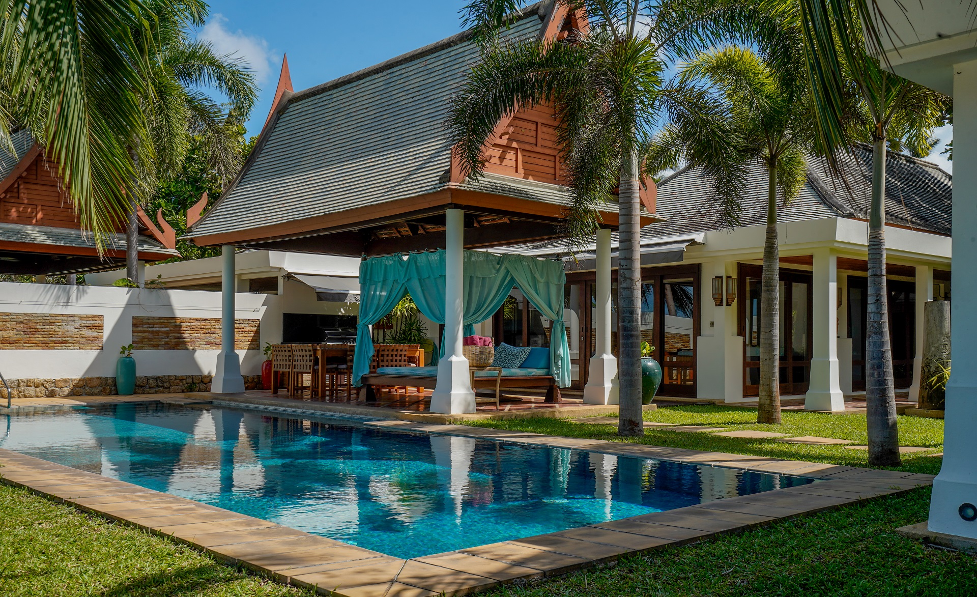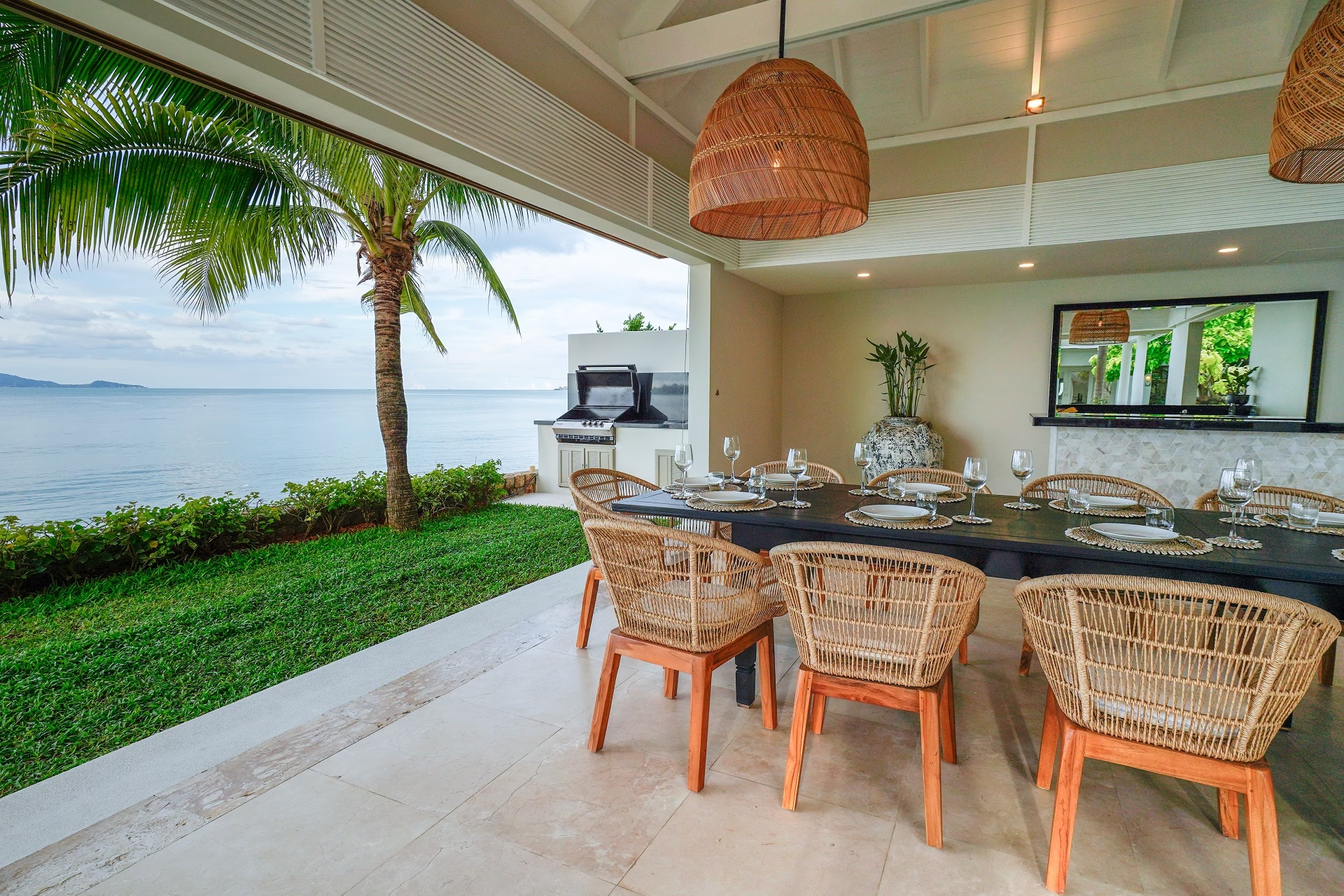 This stunning five-bedroom villa will transport you to Bali with its contemporary whitewashed interior, wood carvings and rattan furnishings. To make the most of the impressive 36 meters of beach frontage, each room is situated around the pool, while the spacious grounds feature tropical gardens, a shaded Thai sala and a large living area.$ 1,995 per night