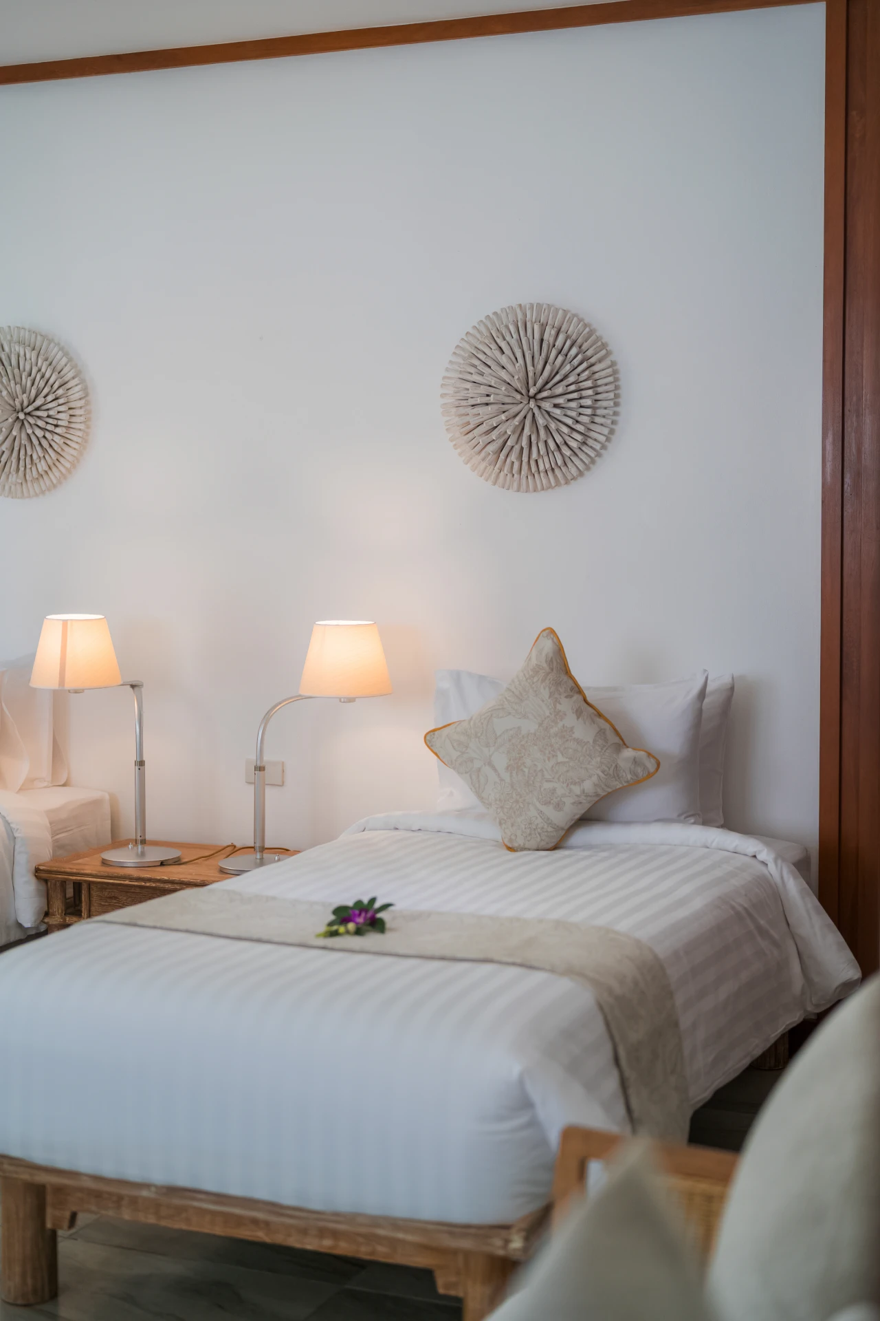 Raised above 37 metres of pristine beach frontage, with its bedrooms and living space on opposite sides, Hibiscus is one of our most private properties. It features a large garden and a shaded outdoor lounge and dining area, while dark wood furnishings, local artwork and cream walls lend an elegant Thai aesthetic.$ 1,662.51 per nightLotus